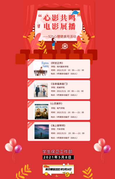 “心影共鸣”电影展播活动是“健康青春你我 献礼建党百年”心理健康活动月系列活动的重要组成部分,它发挥了电影资源的教育教学功能和电影教育手段的优势,有效地将心理健康教育融入到电影赏析当中,以潜移默化的形式促进师生更好地工作、学习和生活,不断奋斗,砥砺前行。